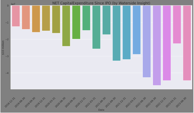 与此同时,Cloudflare 的资本支出一直在增加,尤其是在过去几个季度。考虑到该公司追求将更多人工智能、数据库、物联网、5G 蜂窝和其他网络服务集成到其潜在的未来增长中,这并不奇怪。作为一家高增长的公司,这是可以理解的。