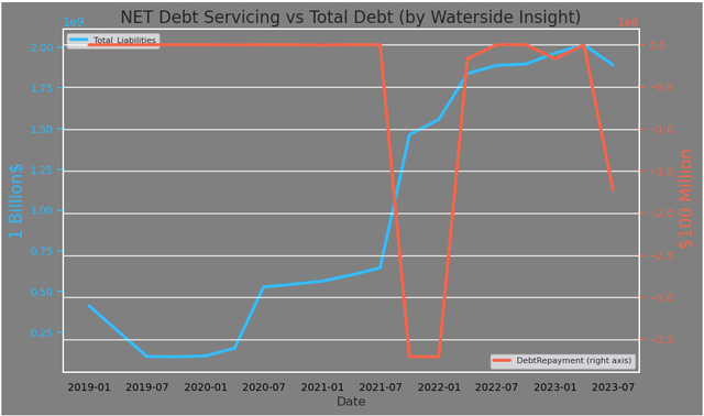 该公司今年 5 月支付了 1.727 亿美元,从 2025 年票据的本金 5.75 亿美元中收回了 1.23 亿美元,其中包括本金和应计利息。这比回购本金高出约 40%。3年后的价格为1.4倍,每年支付的利率似乎接近14%。除了 2025 年票据的剩余金额外,账面上还有 2026 年票据的本金额 12.938 亿美元。其短期债务的偿还才刚刚开始。