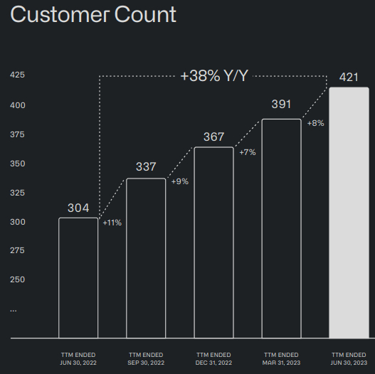 事实上,截至去年6月底,Palantir的总客户数量达到421家,同比增长38%,明显超过其同期收入增长。这意味着新客户不会在 Palantir 的软件解决方案上花费太多,这是由经济环境造成的,客户更注重削减成本和提高运营效率,而不太可能增加新数据分析解决方案的支出。