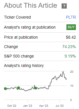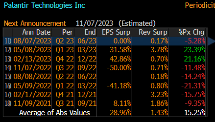 Palantir几周前公布了 2023 年第二季度收益,符合预期,而在前两个季度,它的盈利大幅超出预期。这解释了为什么其股价在当天的反应是负面的,而在前几个季度中,其股价在收益日的反应相当好,如下图所示。