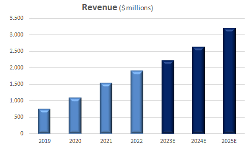 然而,市场预计 Palantir 未来几年的收入增长速度将远低于其年度目标,因为目前的共识预计 2023 年收入约为 22 亿美元(同比增长 16%),2024 年为 26.3 亿美元(+同比增长 19%),到 2025 年将接近 32 亿美元(同比增长 21%)。这也意味着 Palantir 很可能无法实现几年前设定的到 2025 年实现收入约 40 亿美元的目标,因为增长明显放缓,而要达到 40 亿美元的年收入,该公司需要将收入增加到接近 35 亿美元。未来两年每年增加 %,目前看来不太可能。