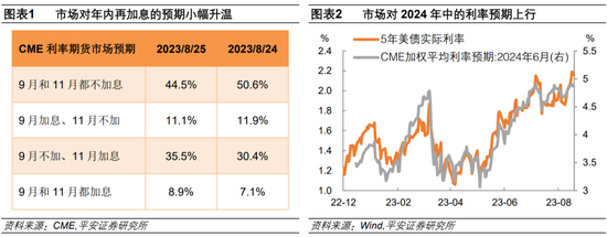 鲍威尔讲话后,市场对年内再加息一次的预期有所升温,但主要资产反应相对平淡、并未出现“恐慌”。8月25日,CME数据显示,9月和11月至少加息一次的概率,由前一日的49.4%上升至55.5%。此外,市场对明年的利率预期也有一定上修,截至2024年6月的加权平均利率预期,由前一日的4.97%升至5.05%。当日,10年美债利率在鲍威尔讲话期间先跳水后反弹,最终基本回到讲话前的波动中枢;美股三大股指一度由涨转跌,但很快又恢复涨势,小幅收涨0.6-1%不等;美元指数也曾经历跳水和反弹,最终收于104上方,创6月以来最高水平。