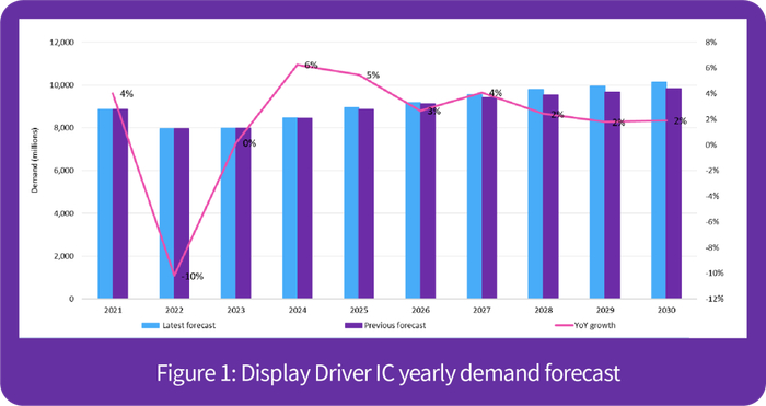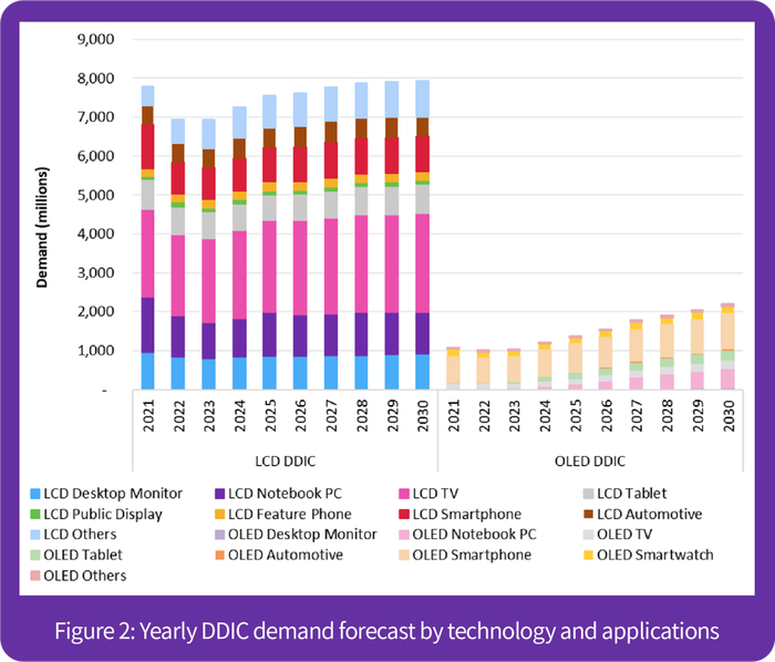 Omdia 预期,随着更高分辨率在许多大尺寸应用中的渗透率越来越高,DDIC 的需求将长期保持缓慢增长。
