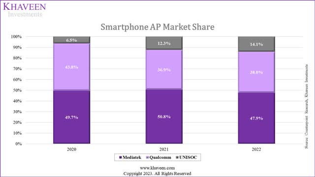 高通的主要风险之一与其手机业务相关,该业务是其最大的业务,贡献了 65% 的收入。高通的竞争对手是联发科,联发科是整个纯智能手机应用处理器的市场领导者。最近,联发科宣布了最新的高端天玑系列,该产品基于台积电领先于高通最先进的 3 纳米工艺技术,这表明联发科可能会尝试在高端市场与高通进行更积极的竞争。
