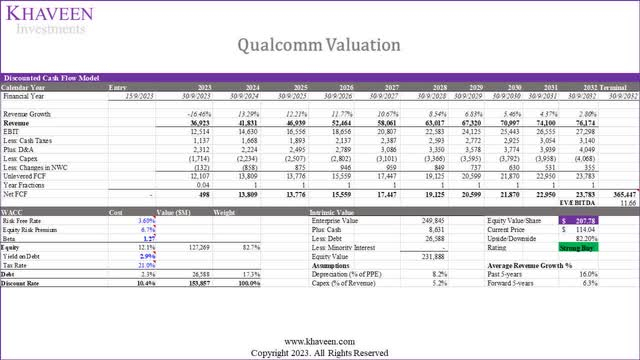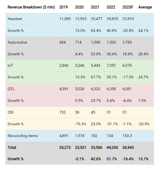 2023年,该公司将之前的RFFE业务整合至这三个业务板块,并相应调整了历史业务板块收入。本文根据 2023 年第一季度到第三季度按比例分配的收入计算出 -16.4% 的总增长,与其 2021 年和 2022 年的强劲表现形成鲜明对比。为了衡量高通的复苏和可持续发展潜力,本文深入研究了每个细分市场 2023 年的减速情况,并预测了它们的增长率增长超过当年。最后,将使用 DCF 分析更新估值。