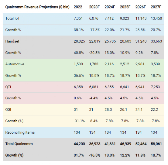总体而言,我们预测高通的物联网领域未来 5 年增长率为 22%。此外,根据 2027 年的预测,我们预计其可持续增长为 20.8%。尽管低于过去 4 年 25.7% 的平均细分市场增长率,但我们的可持续增长率预测仍显着高于整个半导体市场 10 年平均 6.7% 的增长率。
