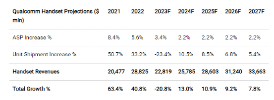 总体而言,预计从 2027 年开始,高通手机业务的预期平均增长率为 4%,可持续增长率为 7.8%。尽管我们预测的 7.8% 可持续增长率低于过去 4 年平均水平 24.1%,但与半导体市场10 年平均增长率 6.7%相比,这一增长率仍然较高。