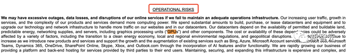 微软的年报中也向投资者强调,GPU是其云业务快速增长的「关键原材料」。如果无法获得所需的基础设施,可能会出现数据中心中断的风险因素。