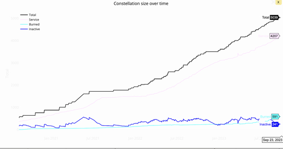 根据星链卫星跟踪器网站数据显示,过去几年已有5039颗卫星被发射到近地轨道。其中,4,207个处于活跃状态,591个已烧毁,241个处于非活跃状态。