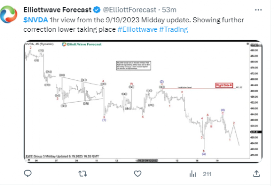 Elliottwave Forecast:从 9/19/2023 午间更新的 $NVDA 1 小时视图。显示正在进一步修正走低#艾略特波#交易。
