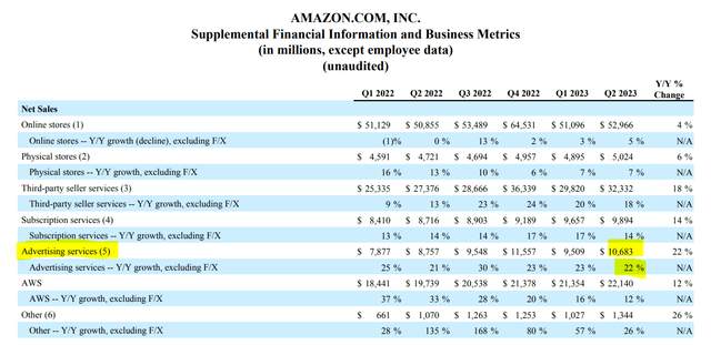 截至2023 年6 月的季度,亚马逊广告服务收入同比增长 22%,达到 107 亿美元。2022 年第一季度,这一收入仅为 79 亿美元,增幅仅约 3 个百分点。遗憾的是,广告业务的营业收入并未披露。但投资者应该认为该业务利润率很高,可能与谷歌实现的盈利能力相竞争。