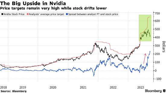 但此后,分析师们变得更加乐观,英伟达的平均目标价升至646美元,较之前上涨逾50%。数据显示,随着股价的回落,如今英伟达的目标股价与当前实际股价之间的差距,已接近有记录以来的最高值。