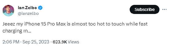 科技媒体9to5Mac的作者Ian Zelbo在社交平台X(前身为推特)上称:“我的iPhone 15 Pro Max在快速充电时太烫了,根本不敢碰。”