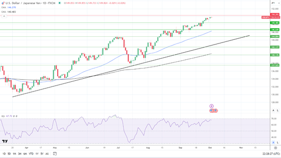 14天RSI为67.72,表明美元/日元在达到超买区域之前可能会回到150。