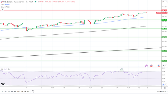 然而,美元/日元跌破50日均线将使空头在148.405支撑位上运行。