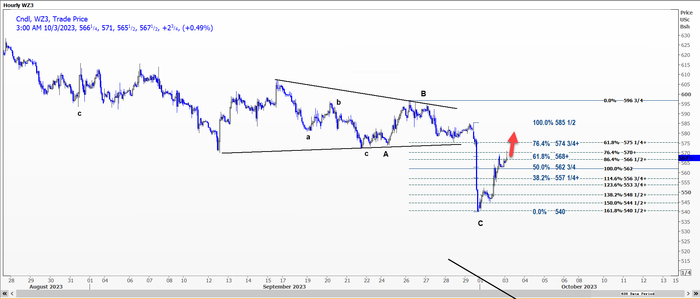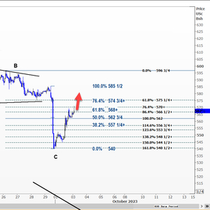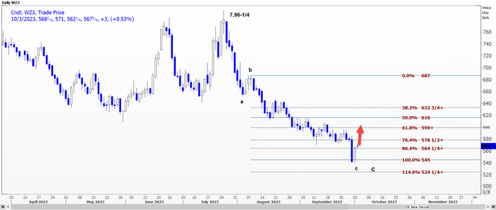 这一波可能结束于545美分附近,或者延伸至该水平以下很多。无论哪种情况,预计情况都会部分逆转。