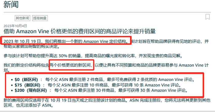 为此,亚马逊最近推出了一个Vine计划新政,增加了两个价格区间,甚至免费赠送。
