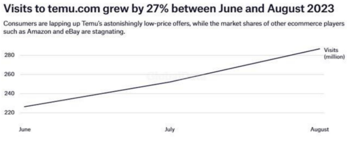 GlobalData的分析显示,Temu现在已经成为许多西方国家下载量最大的App。在6-8月之间,访问量增长了27%。