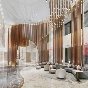 南宁五象希尔顿逸林酒店设计以南宁作为古今贸易汇集地为灵感, 加入铜鼓、壮锦等民族文化元素,巧妙地将每个楼层空间融合在一起,呼应南宁"半城绿树半城楼"的城市特色。从大堂到前台,再经由扶梯通往餐厅和宴会区域,并以屏风格栅引导客人在不同区域之间流动自如。