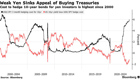 另一方面,美联储的数据显示,外国持有的美国国债占比已经下降了一段时间,今年年初下降到27%左右,是2002年以来的最低水平。日本账户历来是美国政府债券最活跃的买家之一,在今年日元暴跌的情况下,日本账户尤其面临着高得令人望而却步的对冲成本。