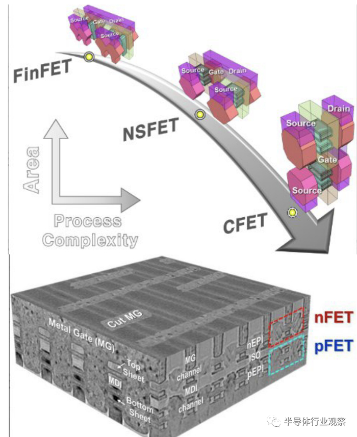 CFET 的想法是由 IMEC 研究机构在 2018 年提出,其中 n 型和 p 型晶体管垂直单片堆叠(参见 IMEC 提出的“ n-over-p”互补 FET 提案)。此后,大量研究论文充实了该提案,但这些论文来自 IMEC 和学术研究人员,而不是商业组织的研发团队。