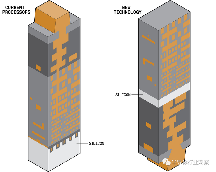 在当今的处理器中,信号和功率都从上方到达硅[浅灰色]。新技术将分离这些功能,从而节省电力并为信号路线腾出更多空间[右]。