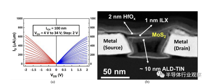 图(a) 显示了所制造的 n/p FET 的良好匹配的输出特性。图(b) 是具有共形栅极堆叠的悬浮 MoS2 纳米片结构的横截面 TEM,该结构包含 10nm TiN、2nm HfOx 和 1 nm ILX(界面电介质)。