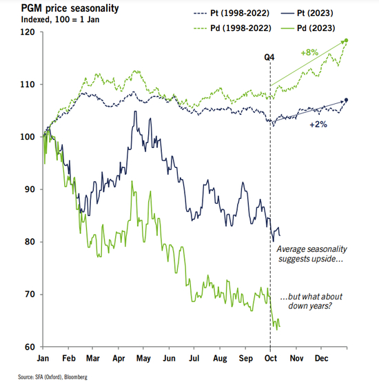他们补充称,由于钯金今年迄今的回报率为五年来最差,铂金和钯金“很可能在2023年底出现亏损,即使考虑到第四季度末可能出现符合季节性预期的反弹”,因为“在钯金熊市期间,价格下跌趋势往往会在最后一个季度延续下去”。