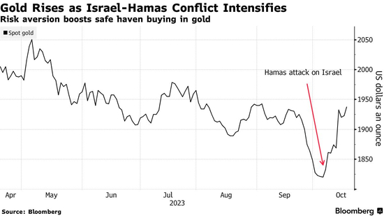 地缘冲突升级的威胁继续为金价提供支撑,自本月早些时候哈马斯突然袭击以色列以来,金价已上涨约6%。此前,该金属的交易价格接近七个月低点,美国国债收益率的大幅攀升严重影响了这种非生息资产。