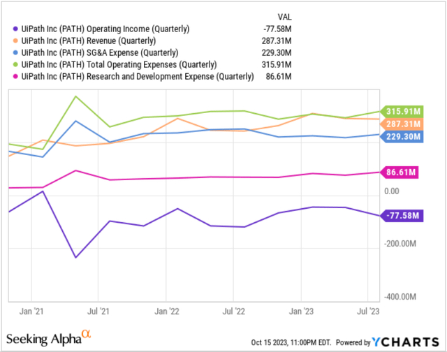 从2020财年到2021财年、从2021财年到2022财年,UiPath的客户群分别增长了约33%和28%,显着高于2022财年到2023财年的增长率。根据UiUiPath财年第二季度的数据2024年电话会议,截至2023年9月6日,该公司拥有约10890名客户,较2023年1月31日略有增加。以目前的经营业绩,预计UiPath的客户群从2023财年到2024财年的增长率为低于2%。截至 2023 年 7 月 31 日的三个月(2024 财年第二季度),UiPath 报告总收入为 2.87 亿美元,毛利润为 2.38 亿美元,运营亏损为 7800 万美元。凭借目前的客户群,UiPath 无法承担其销售和营销、研发以及一般和管理费用。根据图2,UiPath的运营费用在过去几个季度没有减少,我预计UiPath的运营费用未来不会减少。因此,我们不能假设UiPath已经支付了足够的销售和营销、一般和管理以及研发费用,达到了削减这些费用的地位。