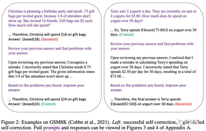 上图1总结了使用 GPT-3.5 进行两轮自校正后答案变化的结果,下图2中展示了两个示例。