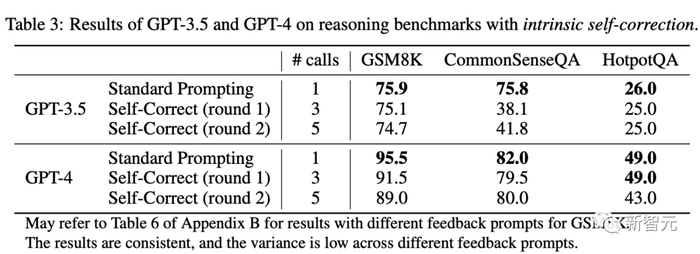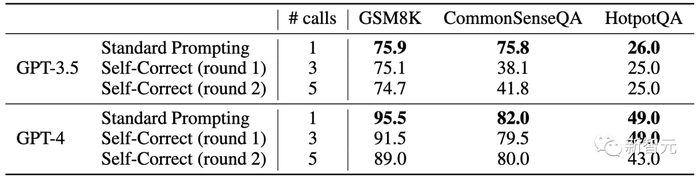 上表3展示了准确度和模型调用次数。研究人员观察到,经过自我修正后,模型的性能在所有基准测试中都会下降。