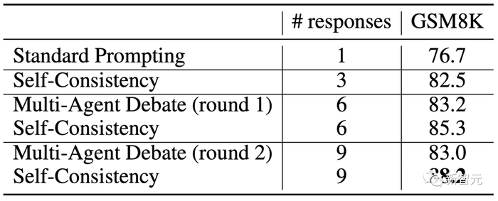 作为改进LLM在推理任务上自我纠正方法的尝试,研究人员还探究了‘多智能体辩论(multi-agent debate)’作为改进推理的手段的潜力。然而,他们的结果表明,在考虑同等数量的响应时,这个方法的效果并不比自我一致性(Self-Consistency)更好。