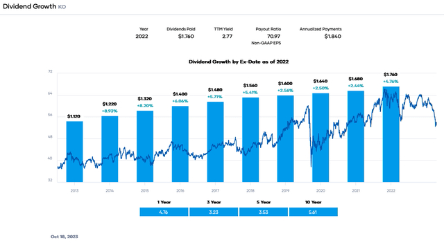 可口可乐的收入和每股收益都在增长。事实上,自 2021 年第一季度以来,该公司的业绩一直超出预期。重要指标正以中个位数到十几位数的速度增长。平均而言,过去五年,有机收入每年增长 7%,每股收益每年增长 6%,自由现金流每年增长 14%。