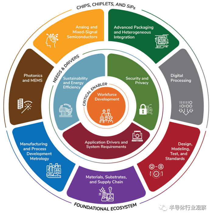 MAPT路线图主要针对未来十年左右(2023-2035)的时间范围,首先分析了时间范围内对于芯片行业的应用需求,包括主要驱动应用、能效比需求以及安全需求,并且根据这些需求,分别分析了半导体各细分行业(数字处理、高级封装和异构继承、模拟和混合信号半导体、硅光技术和MEMS、半导体工艺、设计建模和测试标准、半导体材料以及供应链)需要所对应的技术进步来满足这些需求。