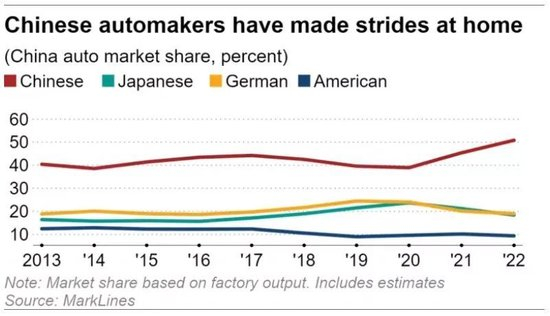 在中国汽车市场,风头正劲的是本土巨头比亚迪和美国纯电动汽车巨头特斯拉。据调查公司MarkLines统计,2022年乘用车销售市场份额(以工厂出货数量为准)方面,中国车企约占51%,比上年提高5.2个百分点;日本车企仅占约18%,下降2.8个百分点。