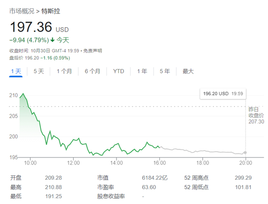财报公布以来,特斯拉股价持续下跌。周一,该股收于197.36美元,下跌4.79%,因特斯拉供应商松下在第三季度大幅削减了电池产量,并将利润前景的下滑归咎于特斯拉需求的低迷。特斯拉股价本月迄今累计下跌21%。不过,该股今年迄今以来的涨幅仍高达60%。
