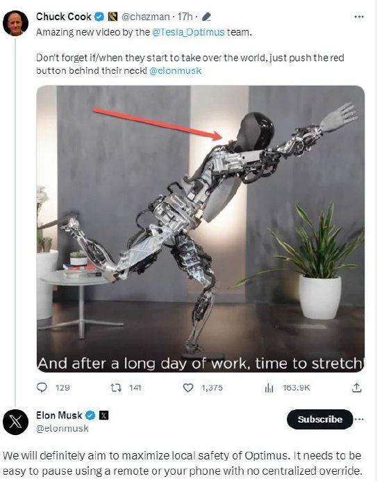 这不是马斯克第一次谈到物理开关的重要性,今年较早时,他在X平台上发布视频展示特斯拉“擎天柱”机器人的最新进展时,一位用户指出了擎天柱脖子后面的一个“红色按钮”,可能是作为防止潜在的机器人统治世界的场景的安全措施。马斯克回应称:“我们一定会尽力保证擎天柱的安全。它需要很容易地使用遥控器或你的手机就能暂停,无需集中控制。”