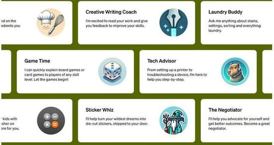 OpenAI称,定制版GPT可以为用户在日常生活、特定任务、工作或家庭中提供帮助,比如帮助学习任何棋盘游戏的规则、帮助教孩子数学、训练写作或是设计贴纸,还可以与他人分享这种自定义的GPT。