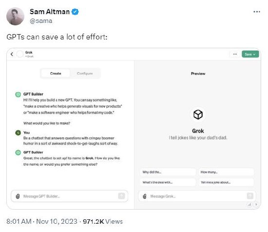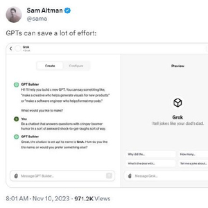 然而,“ChatGPT之父”萨姆·奥特曼(Sam Altman)周四发帖暗示,任何人都可以使用GPT制作像Grok这样的聊天机器人。