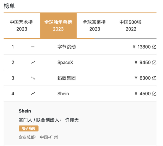 胡润官网显示,SHEIN以4500亿元的估值在全球独角兽榜中排名第四,仅次于字节跳动、SPACE X和蚂蚁集团。