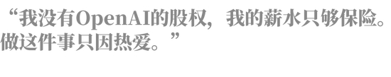奥特曼的回答是:“我没有OpenAI的股权,我的薪水只够保险。做这件事只因热爱。”