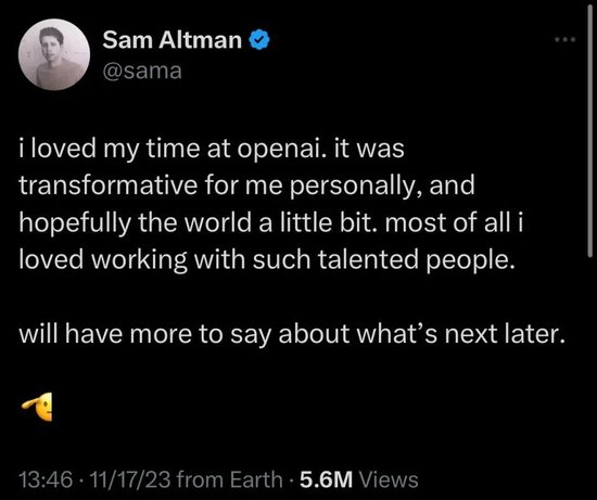 这则消息发布不久之后,奥特曼本人也通过其个人推特账号做了简短回应,他表示,自己热爱在OpenAI工作的这段时间,对他个人来说是转折性的,希望这段时间对世界也产生了一点转折性意义,最重要的是他热爱与一群才能卓越的人在一起合作。在声明的结尾,奥特曼表示“会对接下来做些什么有更多的话要说”。