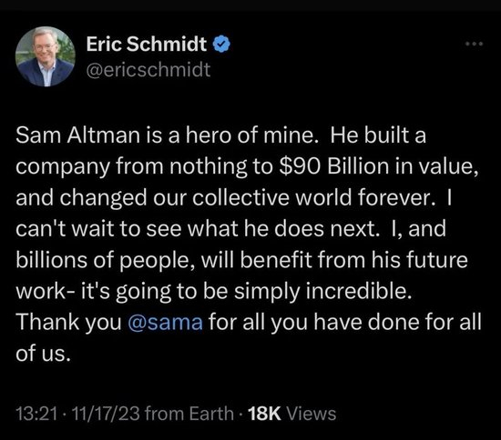 在奥特曼离任CEO的消息传出后,科技圈许多人士纷纷发表评论。谷歌前董事长施密特在个人推特上表示,“奥特曼是我个人的英雄,他将一个公司从零打造成900亿估值,并且永远改变了我们的世界,我迫不及待想要知道他接下来做什么。我和数十亿人都将从他未来的工作中获益,这非常难以置信,感谢你为我们做的一切。”