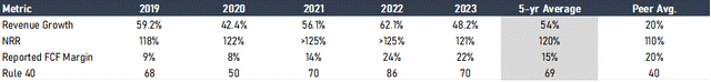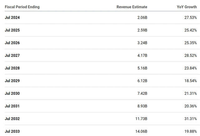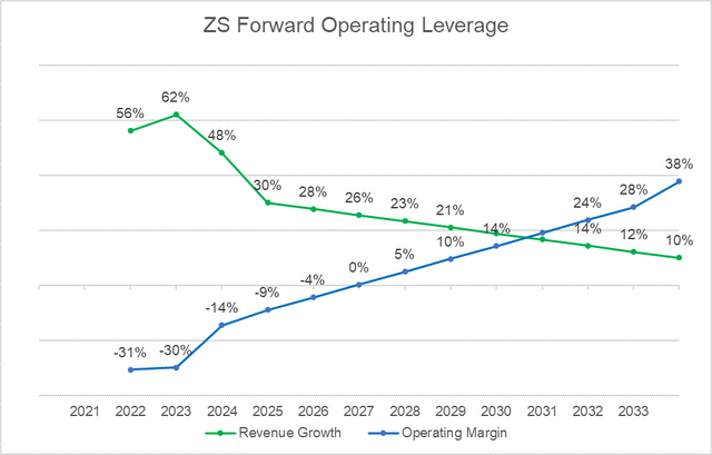 Zscaler 的 "护城河 "使其能够在收入和市场份额增长方面继续超越同行。其高度可扩展的业务模式应能在未来产生巨大的经营杠杆效应。Zscaler 的卓越增长毋庸置疑。过去 5 年,该公司的平均增长率为 54%,几乎是竞争对手的两倍。Zscaler 行业领先的基于美元的净收入保持率("NRR")也凸显了这种收入的粘性以及他们在内部扩大每个现有客户收入的能力。此外,Zscaler 总收入的 97% 是通过1-3 年期合同实现的经常性收入。他们通过直销和渠道合作获得了主要的企业客户,甚至赢得了美国 15 个内阁级联邦机构中 12 个机构的合同。Zscaler 的增长潜力毋庸置疑。分析师预计未来十年的年增长率约为 20%,管理层预计来年的增长率为 33%。