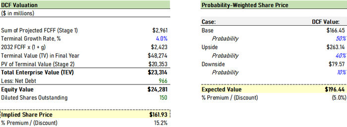 得出的公允价值为每股 162 美元。我还对上述收入增长和营业利润率假设进行了上下调整。然后,我给每种情况分配了概率,得出加权平均值。考虑到 Zscaler 的优质基础业务和增长潜力,我对上行情况的加权概率为 40%,对基本情况的加权概率为 50%,对下行情况的加权概率为 10%。因此,预期价值约为每股 196 美元。