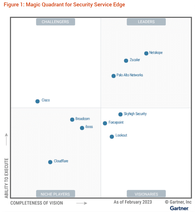 Zscaler 同时提供 SASE 和 SSE 功能,但被 Gartner 认定为 SSE。Zscaler 已连续 12 年在 Gartner 的魔力象限中处于领先地位。2023 年,其唯一的竞争者是私营公司 NetSkope,该公司的评价与 Zscaler 相当,2022 年的收入约为 3 亿美元,而Zscaler 的收入超过 10 亿美元。