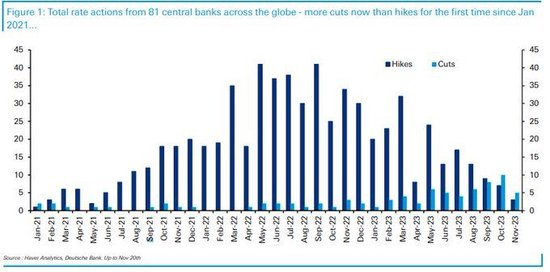 根据德意志银行(Deutsche Bank)研究策略师Jim Reid的分析,本月全球降息的央行数量有望连续第二个月超过加息的央行,而之前出现类似的情况还要追溯到2021年1月。