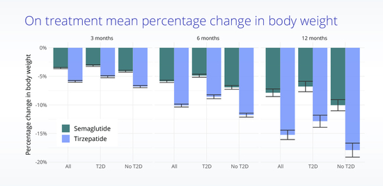 数据还显示,在各服用3个月后,替尔泊肽组平均体重下降了5.9%,司美格鲁肽组为3.6%;6个月后,替尔泊肽组的降幅为10.1%,司美格鲁肽组为-5.9%;12个月后,这两比例为15.2%和7.9%。
