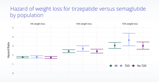 但Truveta使用多种严格方法追踪1.8万多名患者后的分析结果显示,服用替尔泊肽患者体重减轻5%的可能性是服用司美格鲁肽的1.8倍,体重减轻10%的可能性是6倍,减轻15%的可能性则为3倍。